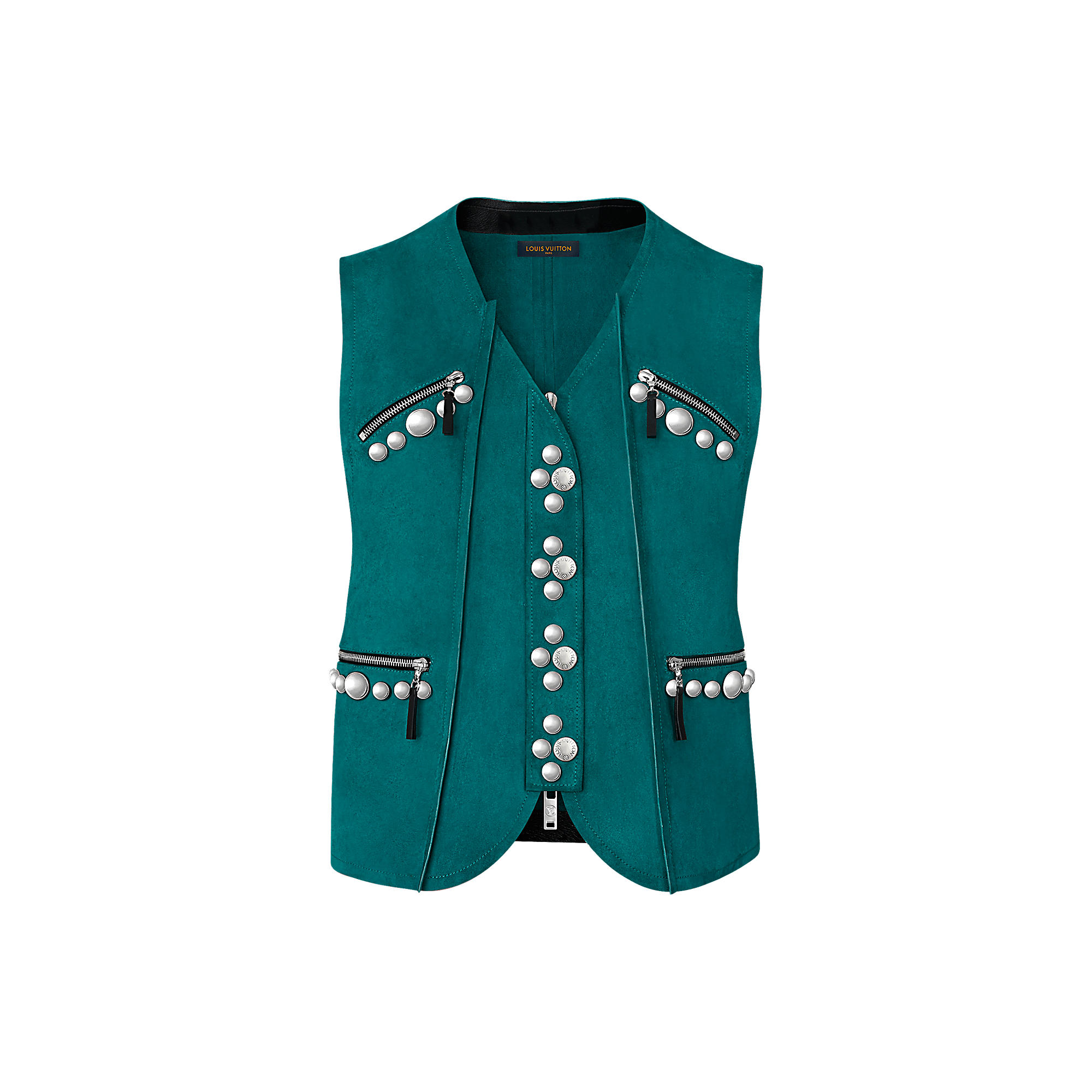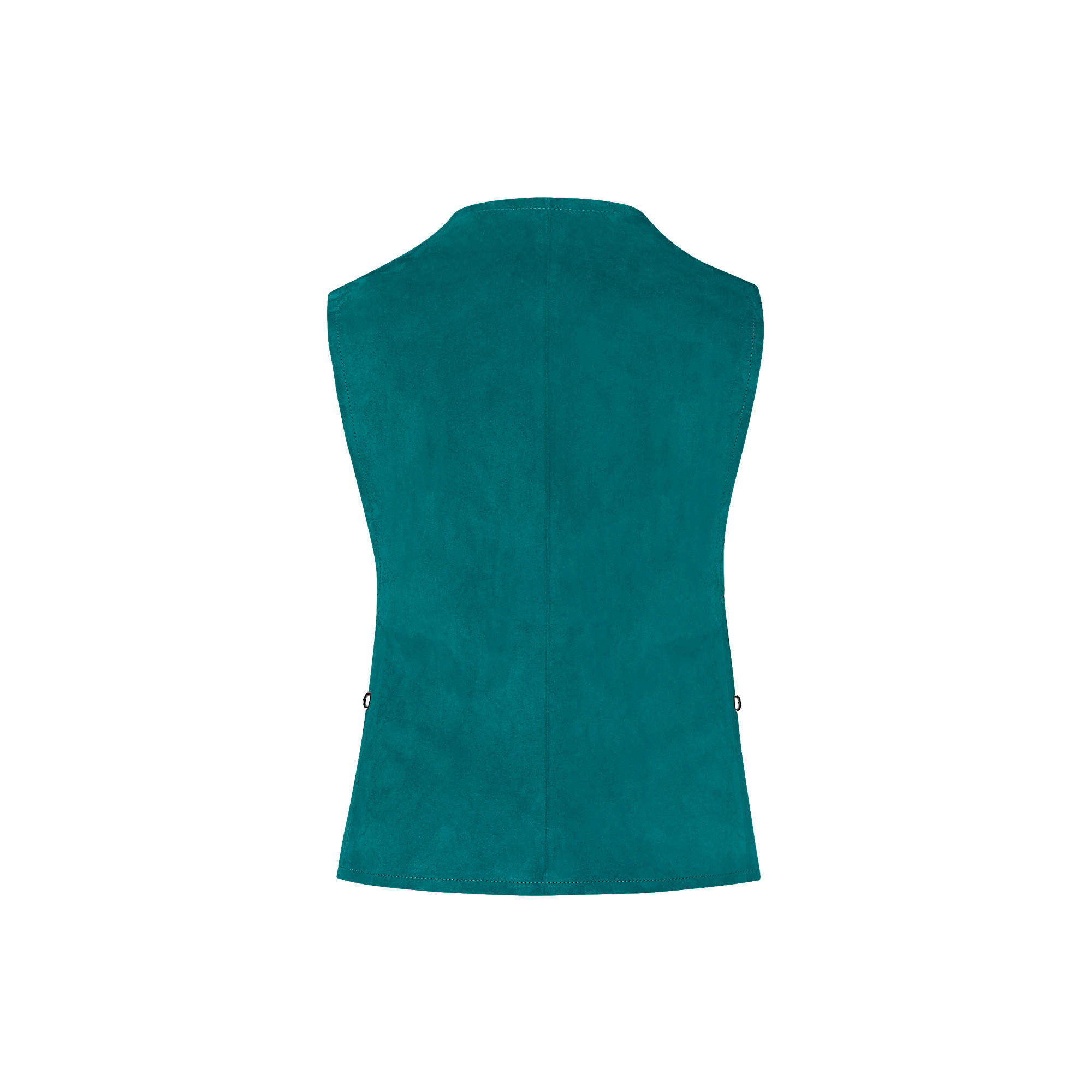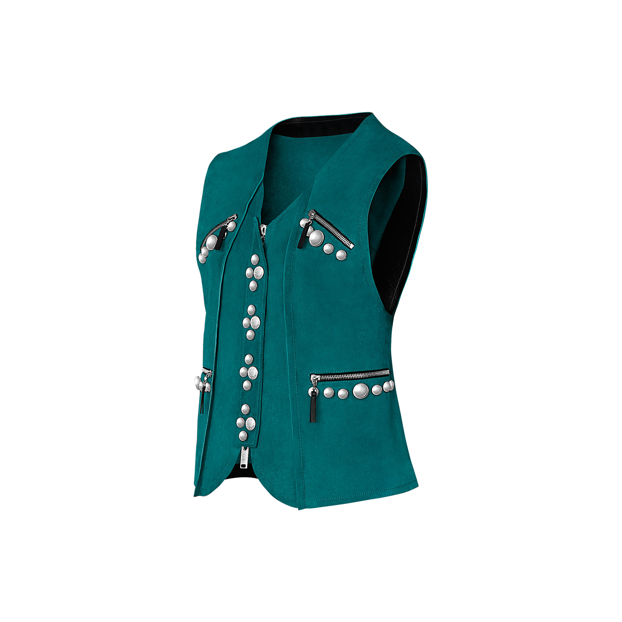 Gilets are an important element of this collection and this one in firm suede calfskin features the season’s round studs adorning the front and a deep emerald green shade symbolising nature. The piece lends itself to mixing and matching, and can be easily layered over a top or a dress.