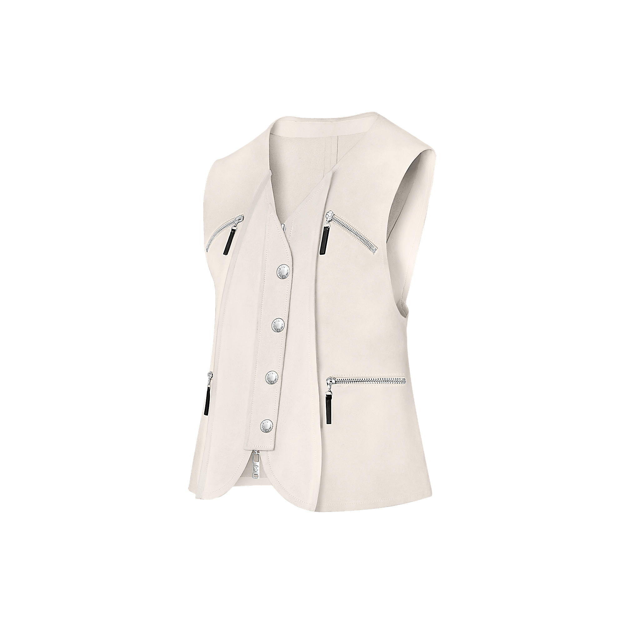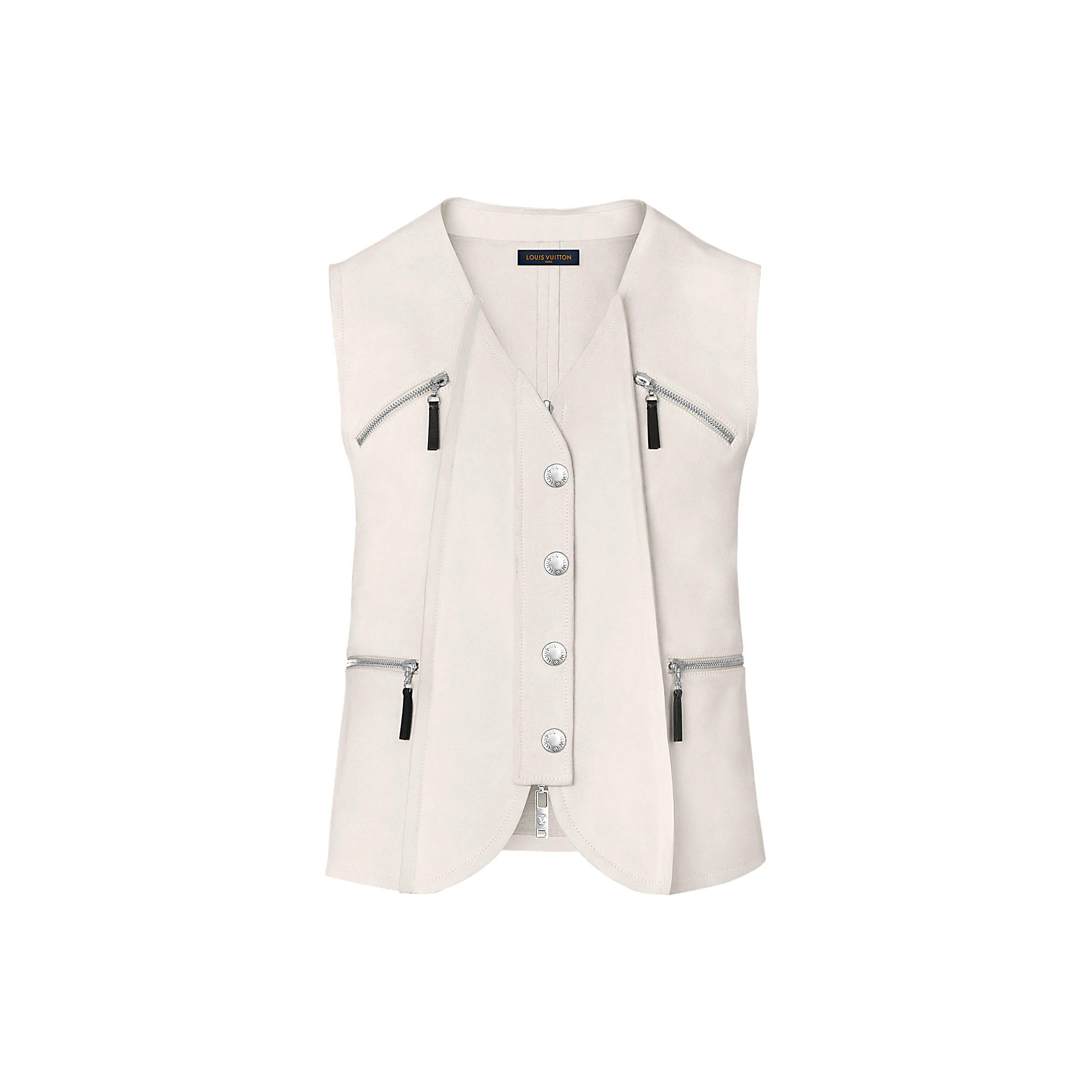 This stripped-down version of the season’s gilet in firm suede calf features four zipped pockets and the emblematic oversize zip. With Louis Vuitton snap buttons adding a subtle signature, it is an ideal layering piece to mix and match with a top, pullover, dress or jacket.