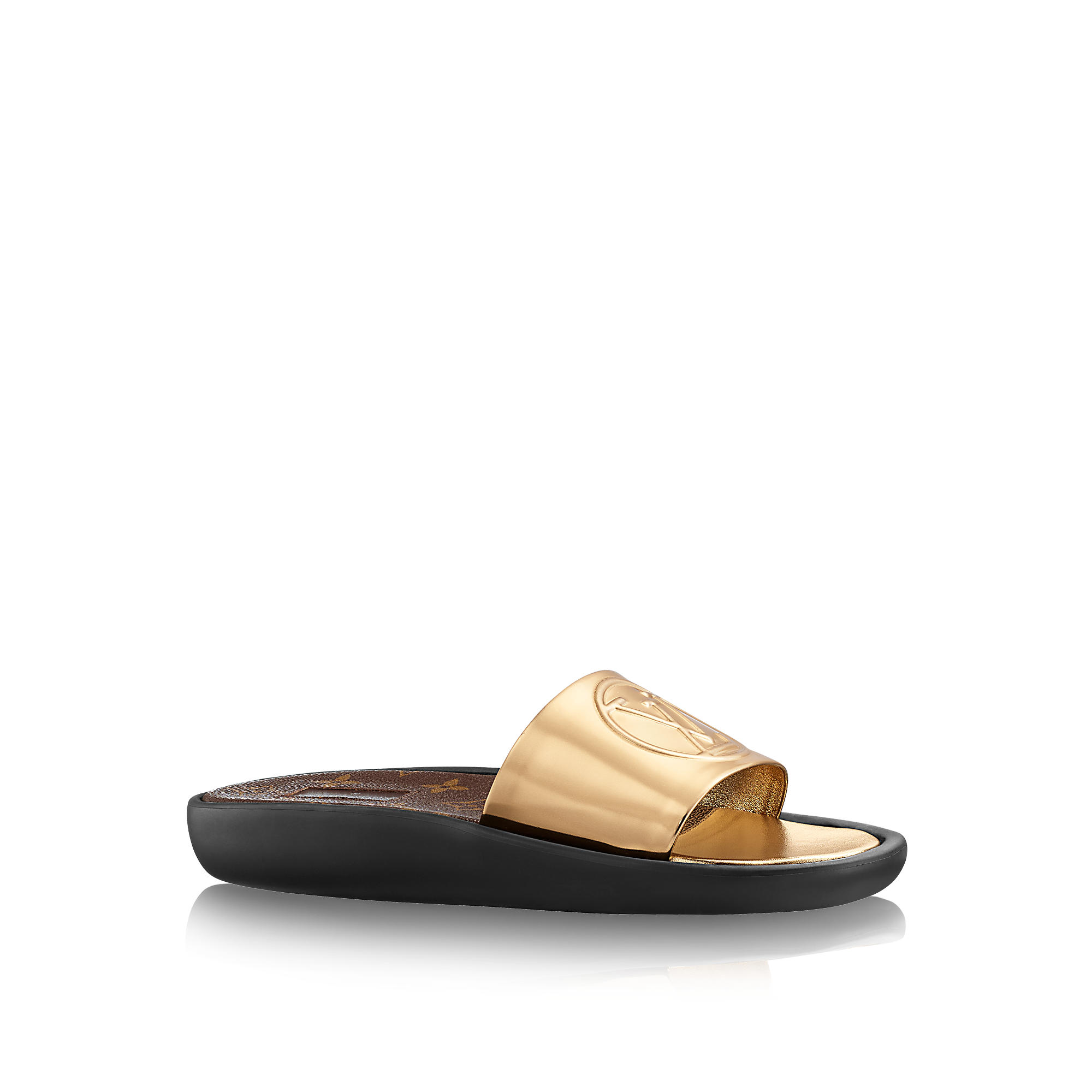 This relaxed summer mule contrasts an eye-catching metallic calf leather strap and Monogram canvas insock with an exceptionally comfortable thick rubber sole.