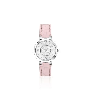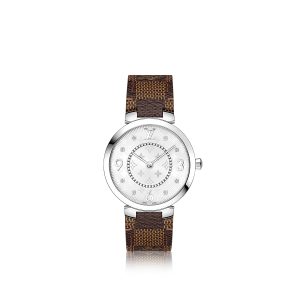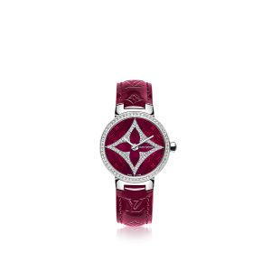 The Tambour Moon collection pays tribute to the original Tambour collection. The case represents a variation of the iconic Tambour shape with a unique inward curve, giving the watch a crescent-shaped profile. The concave edge creates a clever play on light and reflections that spreads to the case’s every curve. The watch is worn with an interchangeable strap equipped with Louis Vuitton patented system.