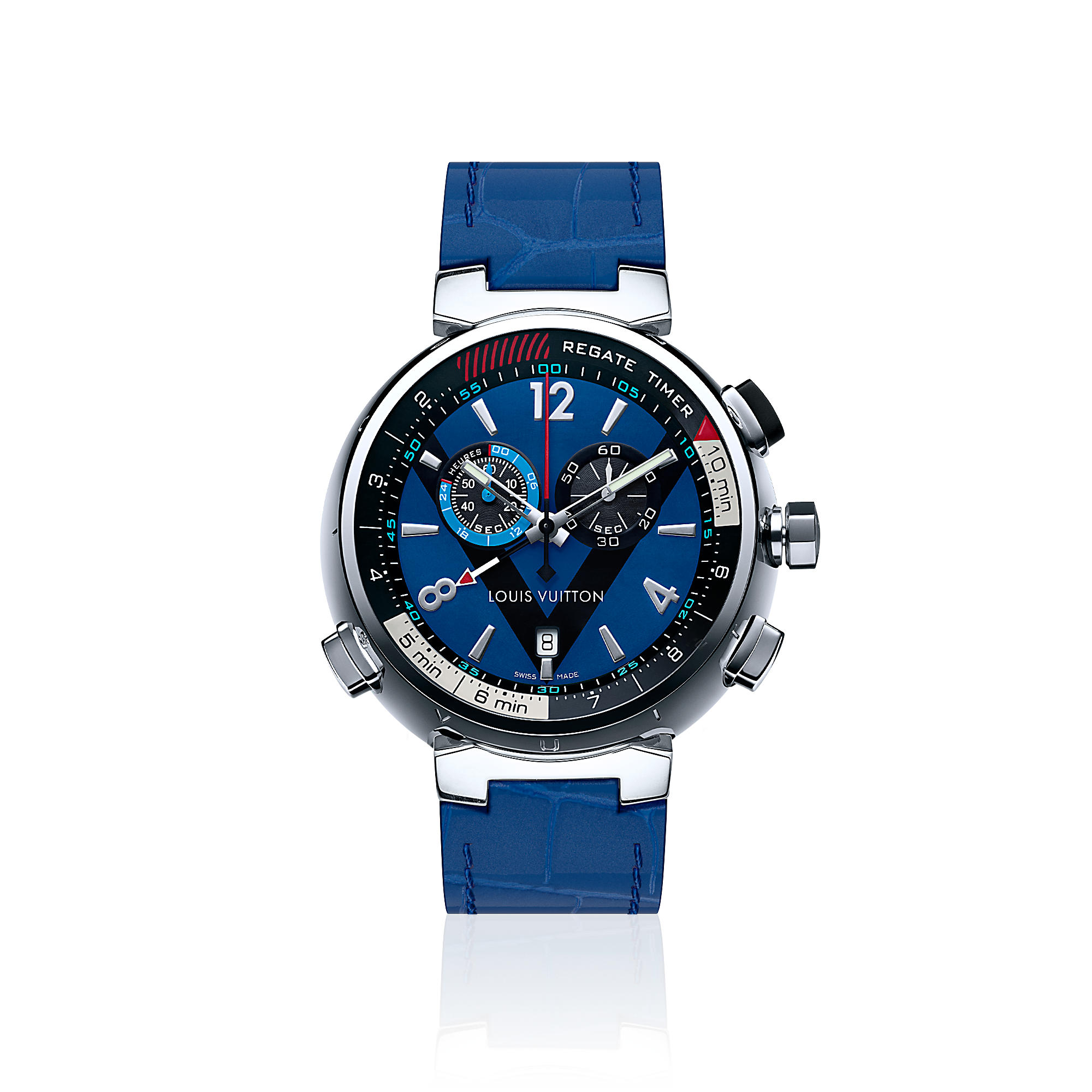 – Blue dial with black V signature