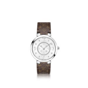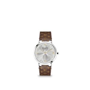 – Silvery guilloché sunray dial with 8 diamond indexes, a hologram Monogram pattern, mirror-polish LV lozine track minute and LV initials at 12 o’clock