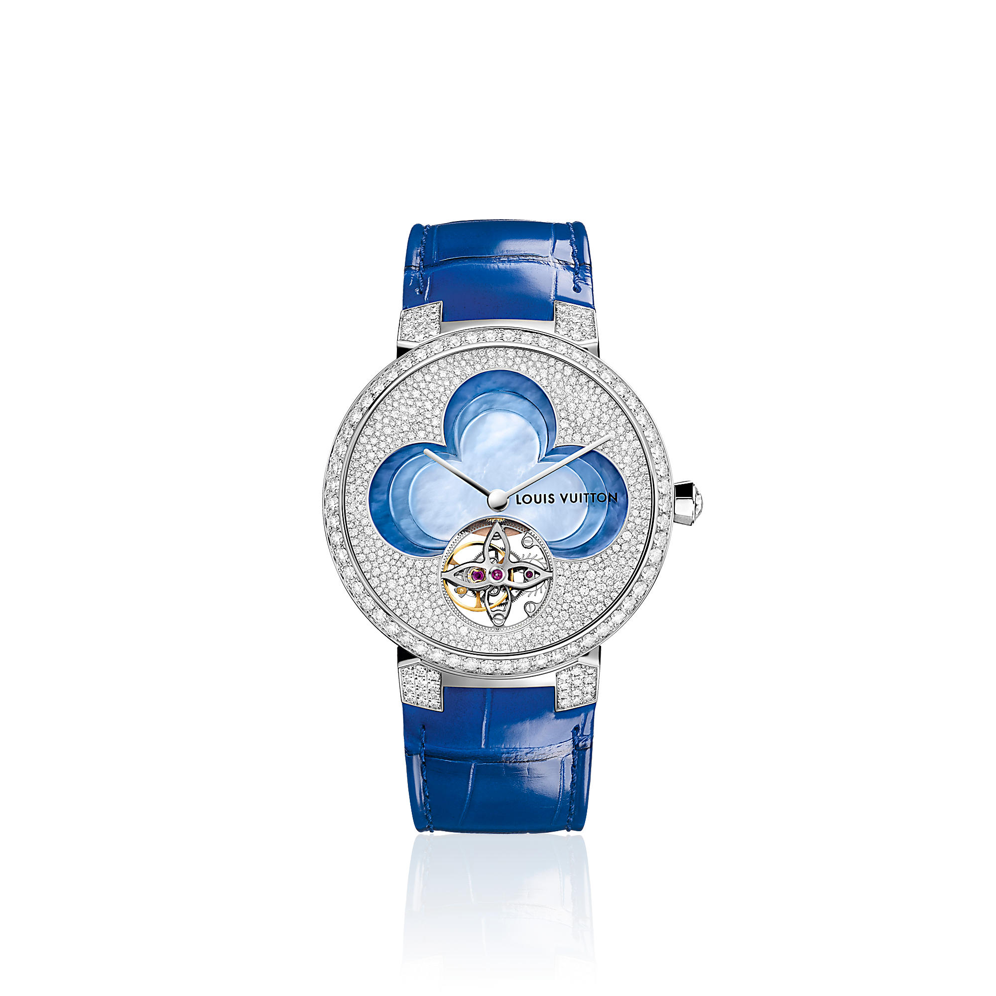 – Sculpted mother-of-pearl Monogram flower enhanced with blue shading on the dial set with 480 diamonds
