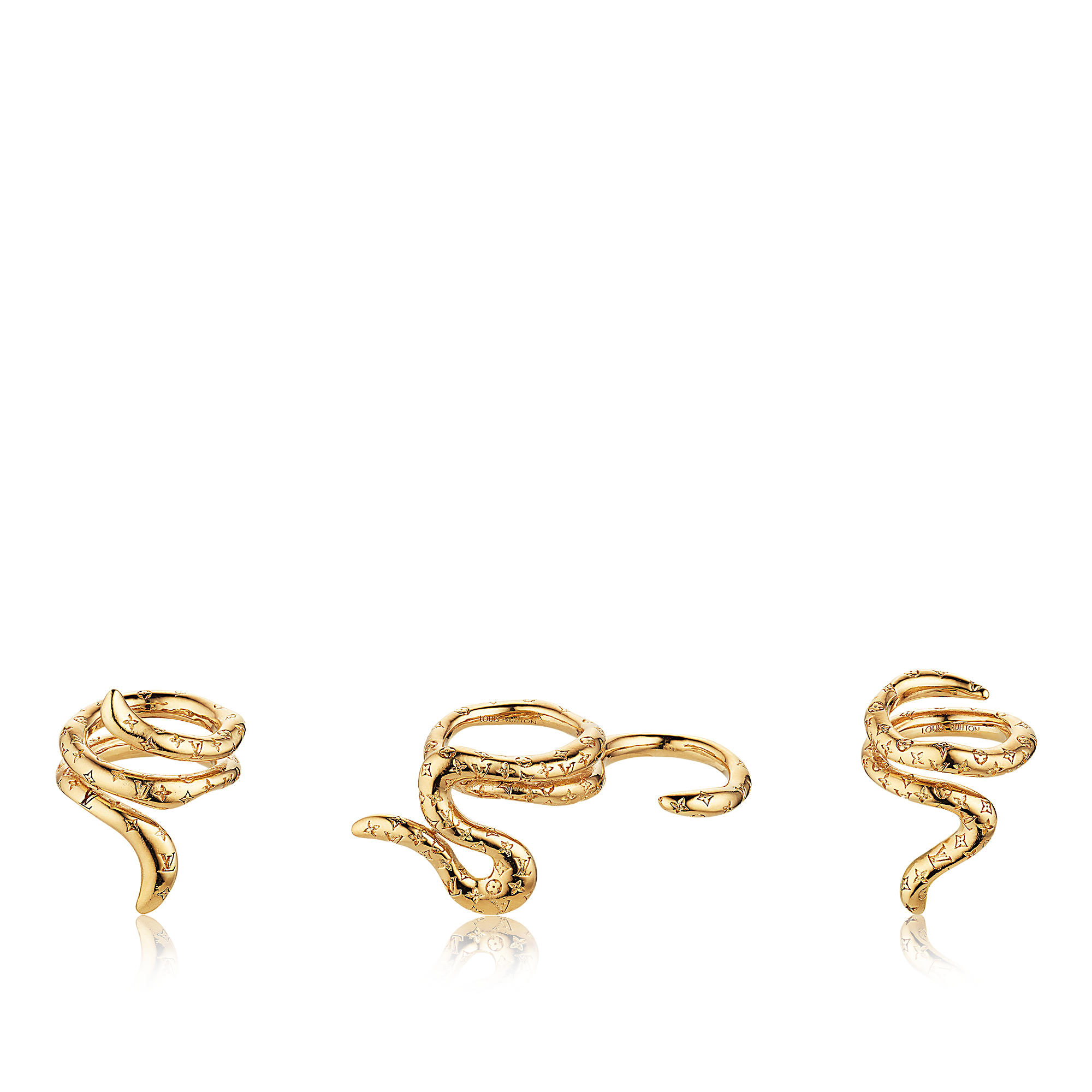 Like the tentacles of some fabulous sea creature, these golden rings loop sensuously around the fingers. Inspired by Japanese tradition, each piece of this statement trio is engraved with the iconic Nanogram pattern and the “Louis Vuitton” signature.