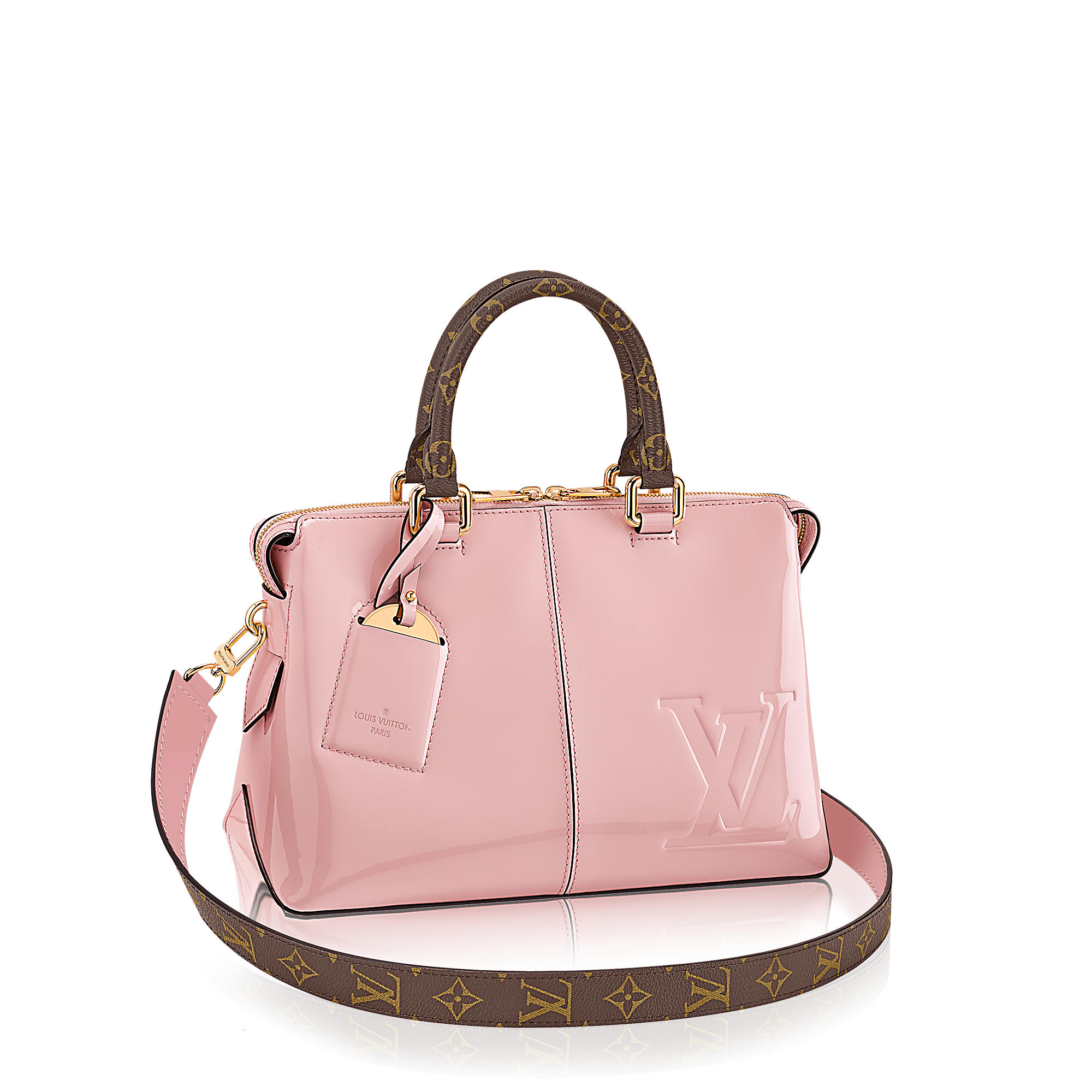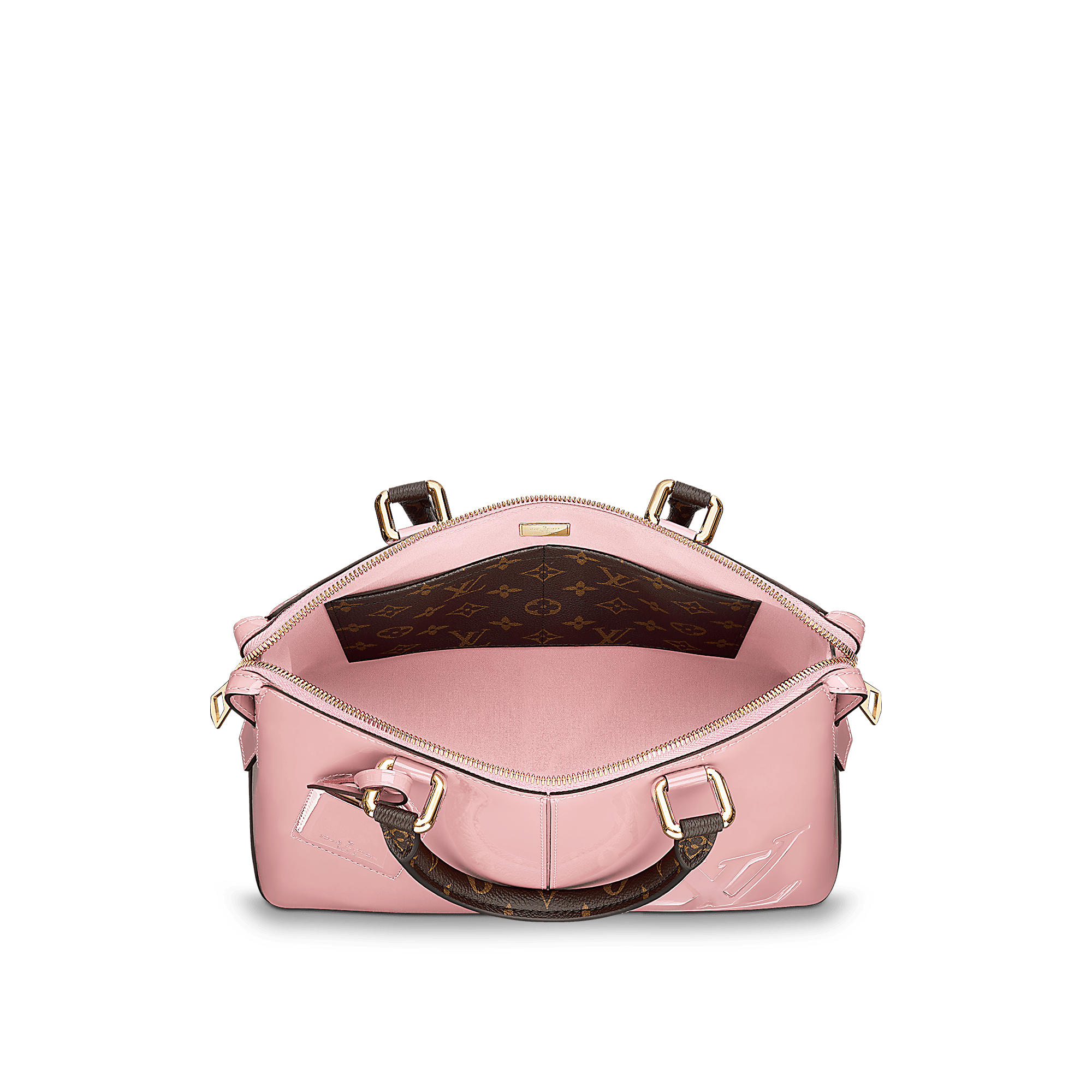 Daring and modern, the Tote Miroir in smooth patent calf leather is distinguished by its embossed LV initials signature, sleek shape and unexpected combinations, combined with handles and shoulder strap in a contrasting colour or iconic Monogram canvas. True to its name, it features a bag charm with a pocket mirror.