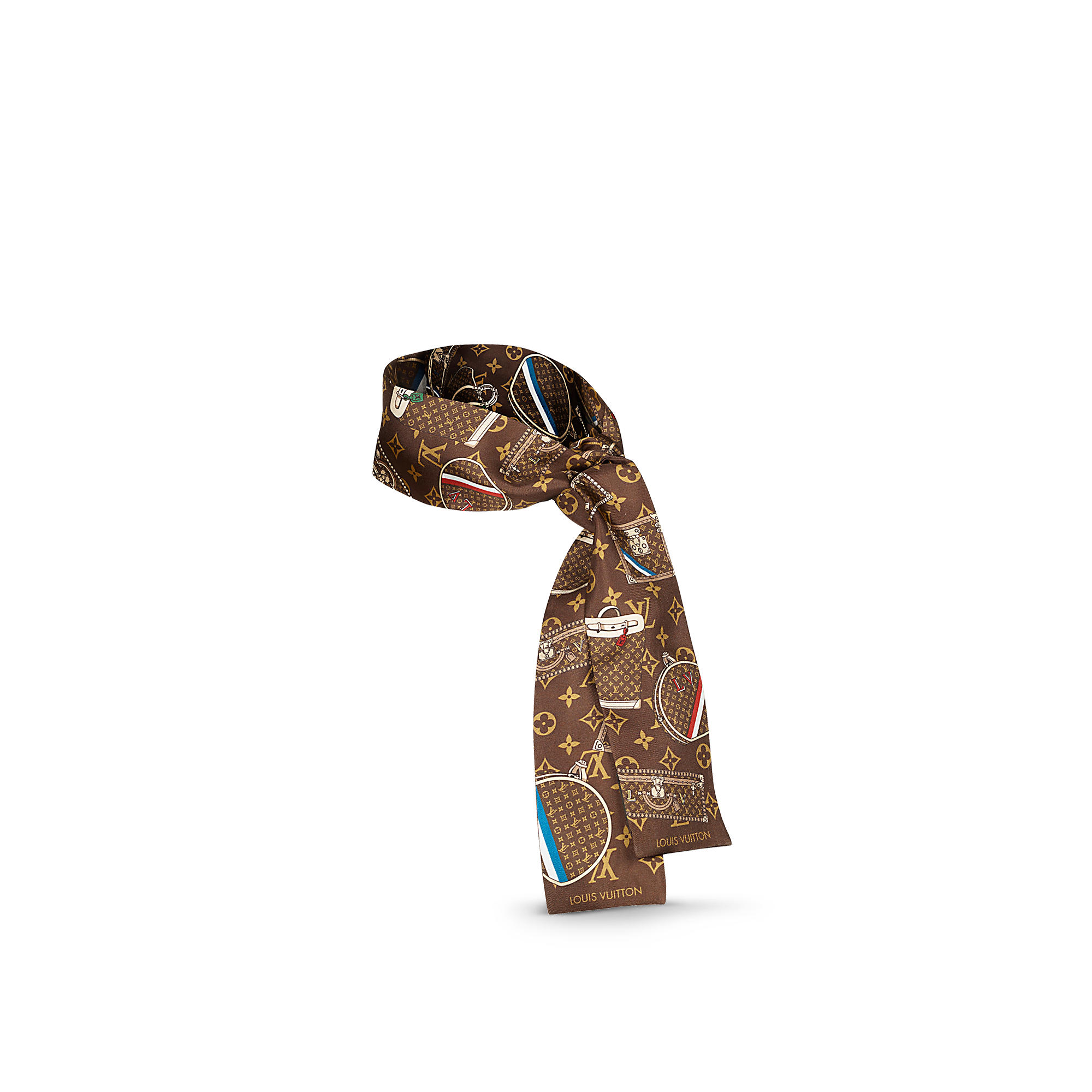 Inspired by the theme of travel, this silk bandeau, which can also be worn as a headband or a belt, combines the iconic Monogram pattern with references to Louis Vuitton’s historic luggage designs.