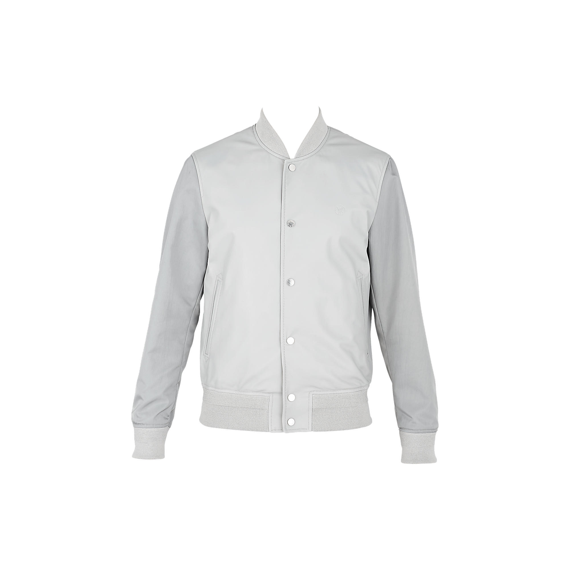 A classic calfskin jacket with knitted cotton panels on the sleeves and cotton ribbing on collar, waist and cuffs. It features two large patch pockets with an embossed signature.