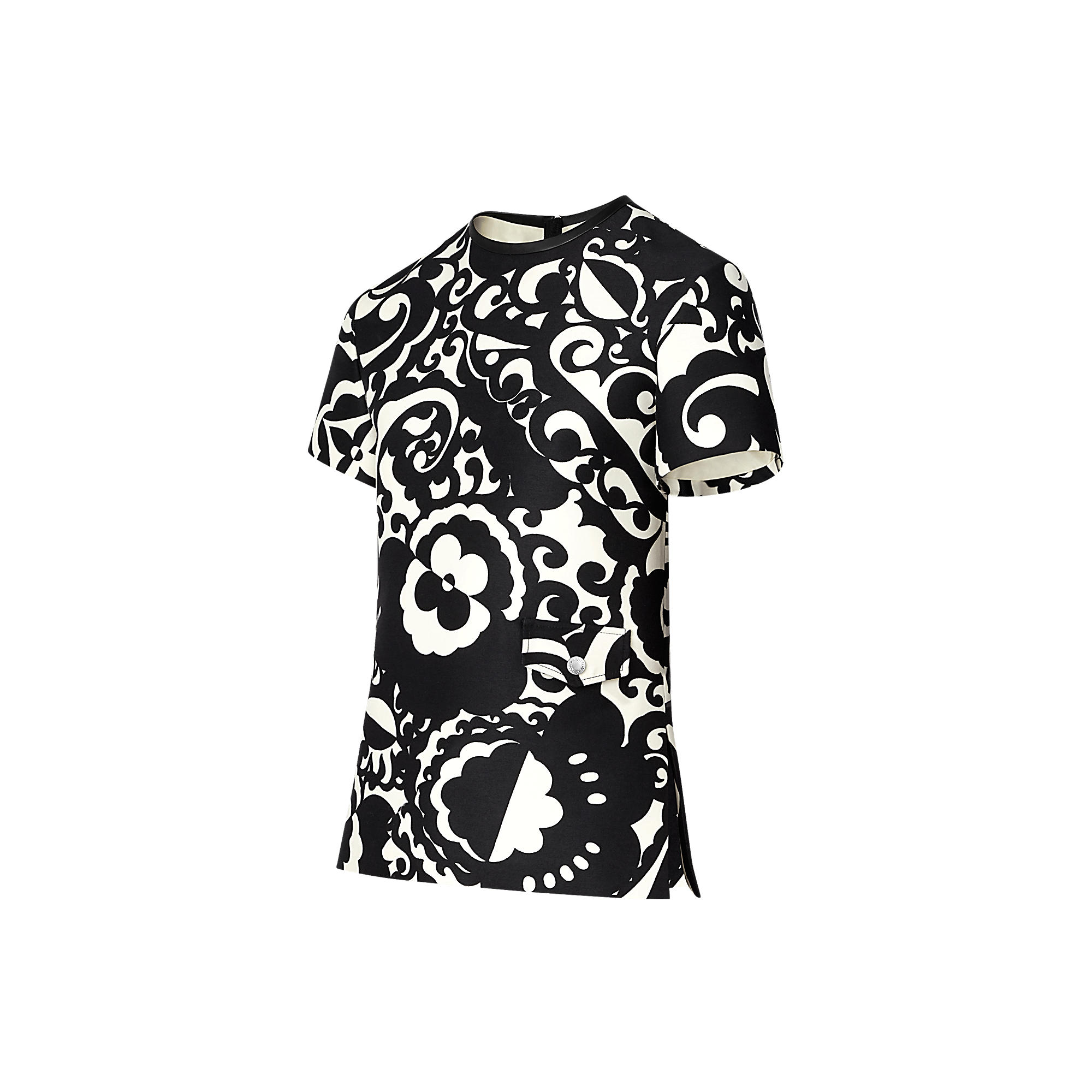 Styled as a tee shirt, this blouse features an eye-popping Optical Flower print, in which a macro sized Monogram flower is playfully inserted. It has a leather neckline trim while slits on the side add feminine allure.