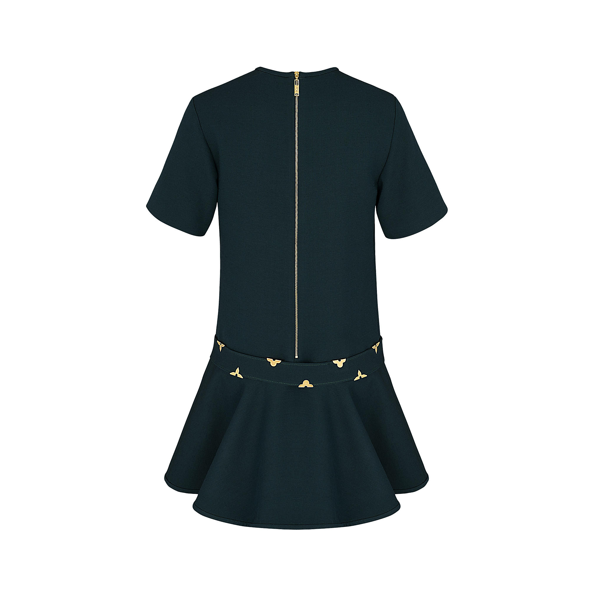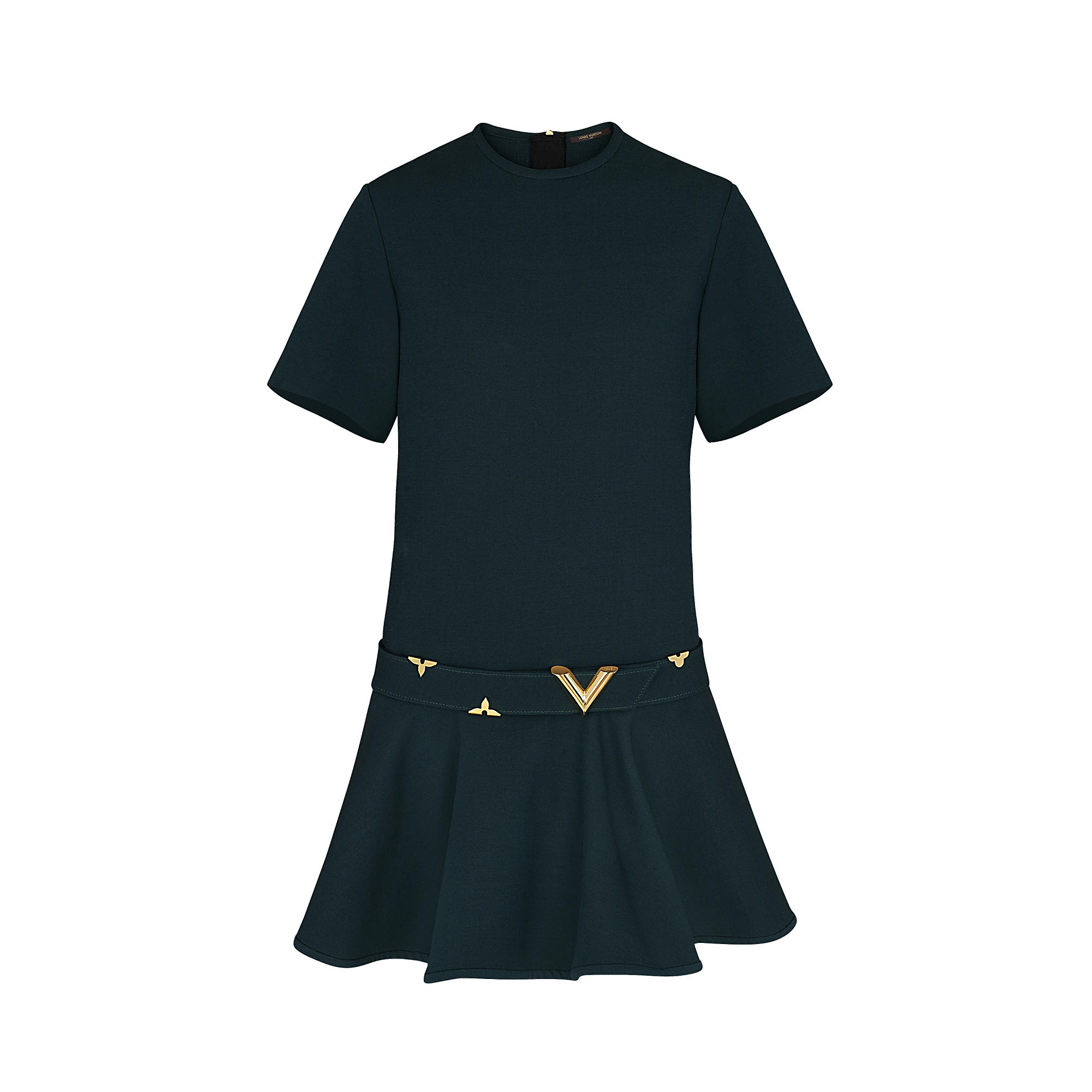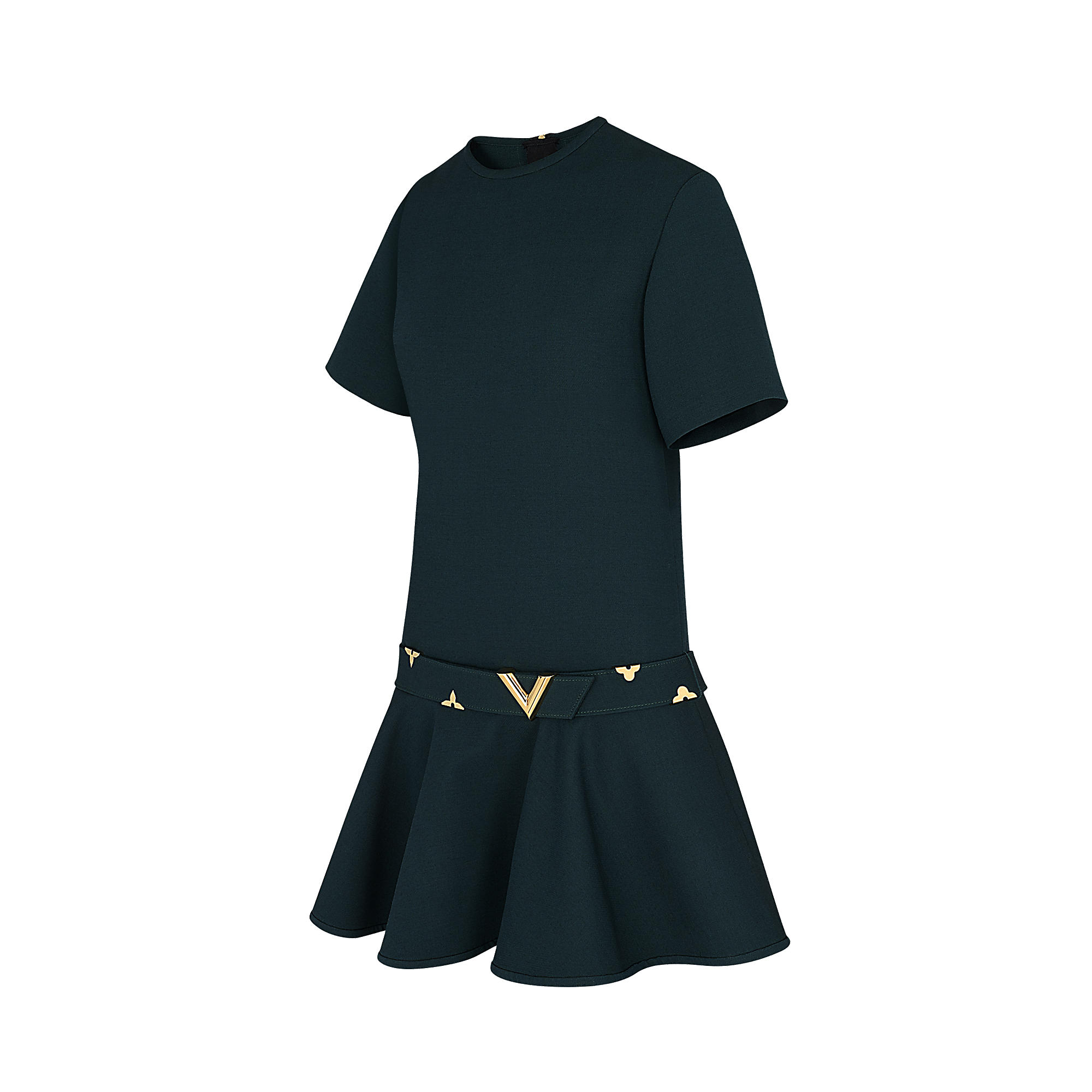 This elegant mini-dress in silk cady and wool features a flounced skirt and a long gold zip at the back. The low-waisted belt is adorned with iconic Flower Crowns and a jewel clasp with a signature gold V motif.