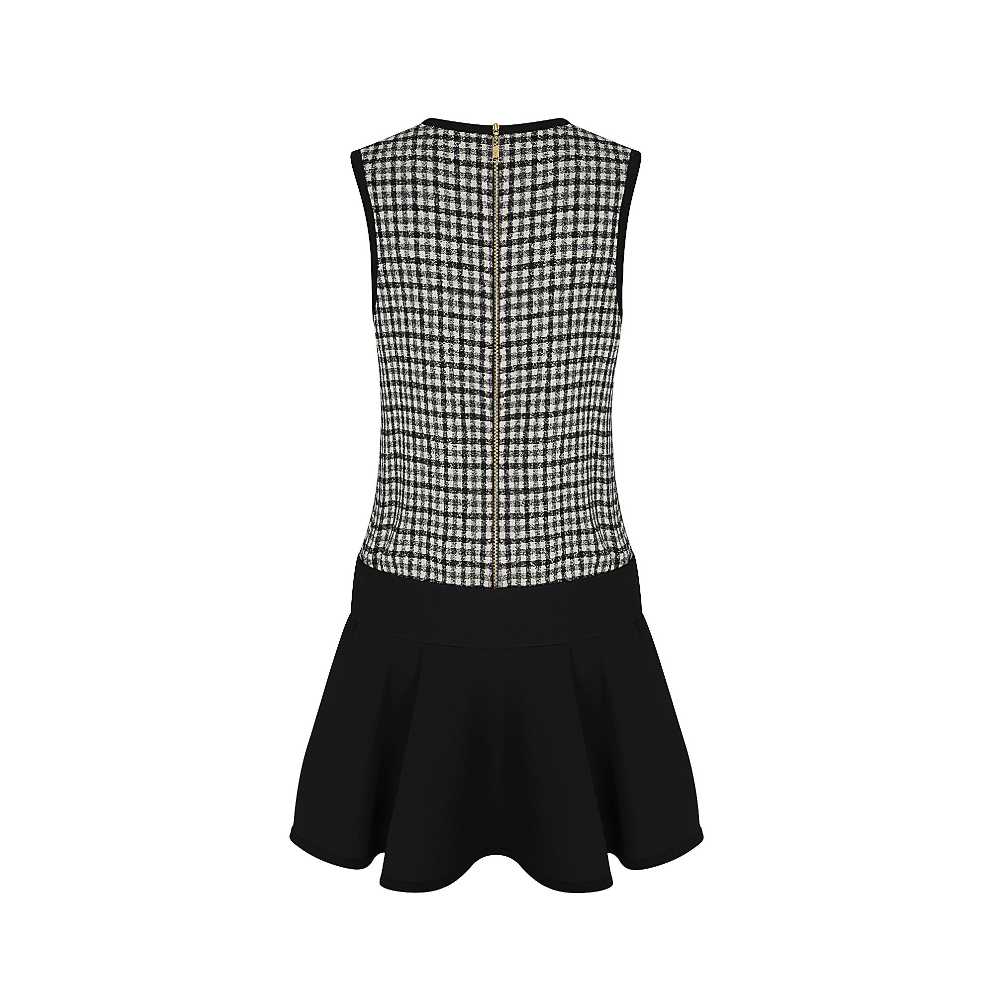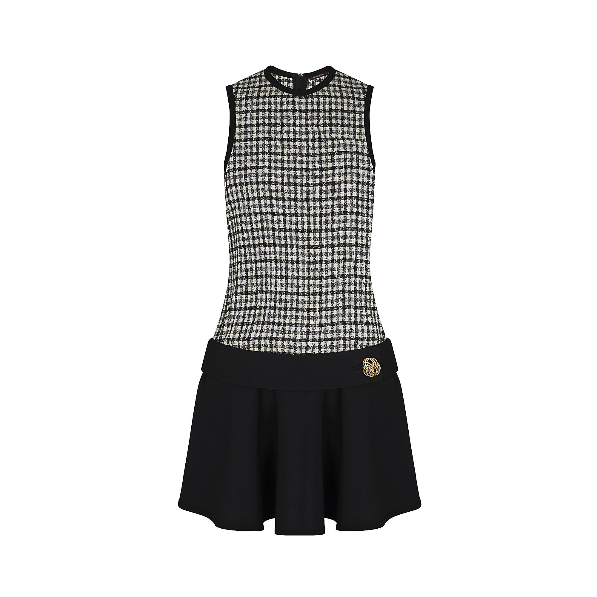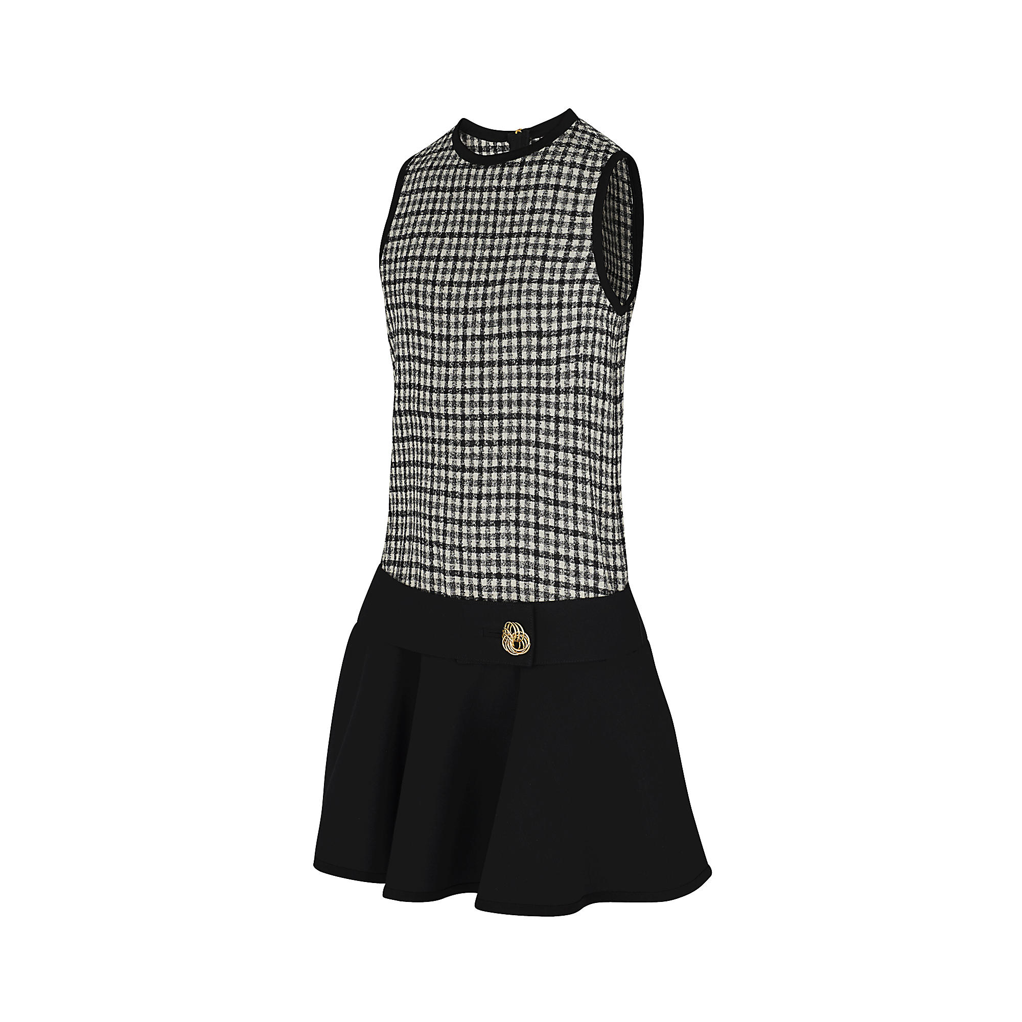 This sleeveless minidress has a long, straight-cut top in light wool boucle check and a skirt in silk and wool. Low on the waist, a silk and wool belt features a jewel button.