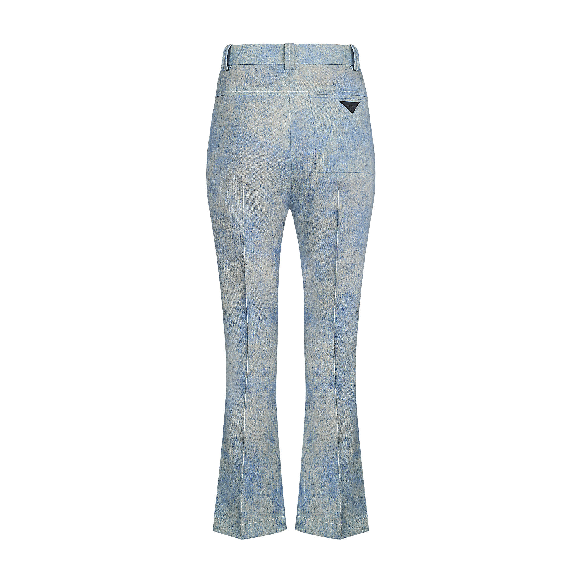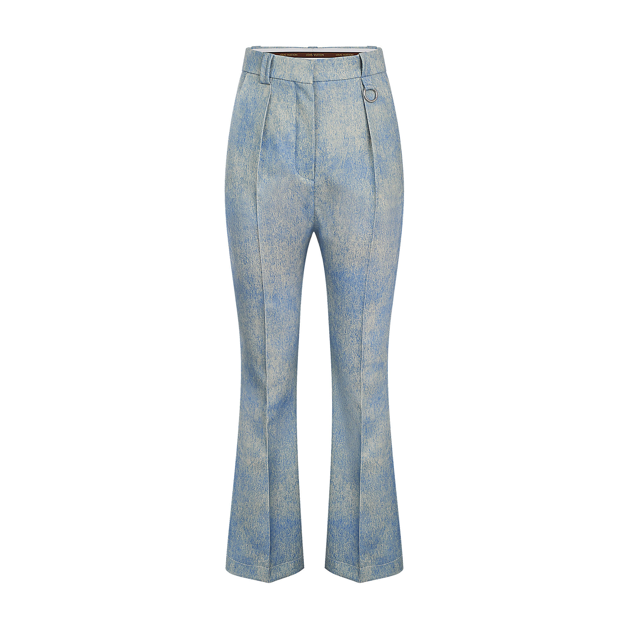 Featuring a low crotch, flared leg and cropped length, this new pant silhouette offers Nicolas Ghesquière’s reinterpretation of denim with a luxury twist. Made by printing denim wash onto a wool twill base, it includes this season’s new embossed Louis Vuitton triangle leather patch on the back pocket.