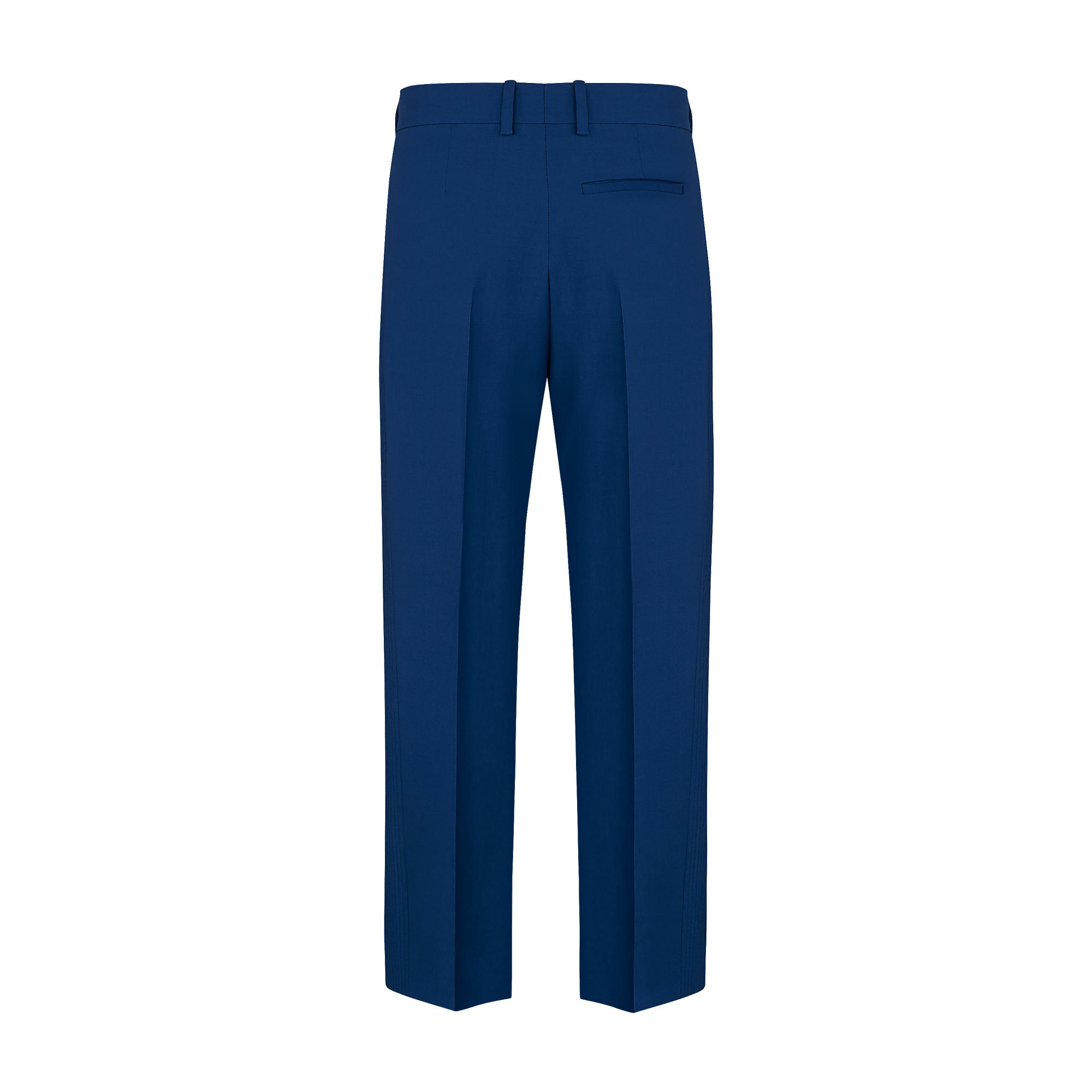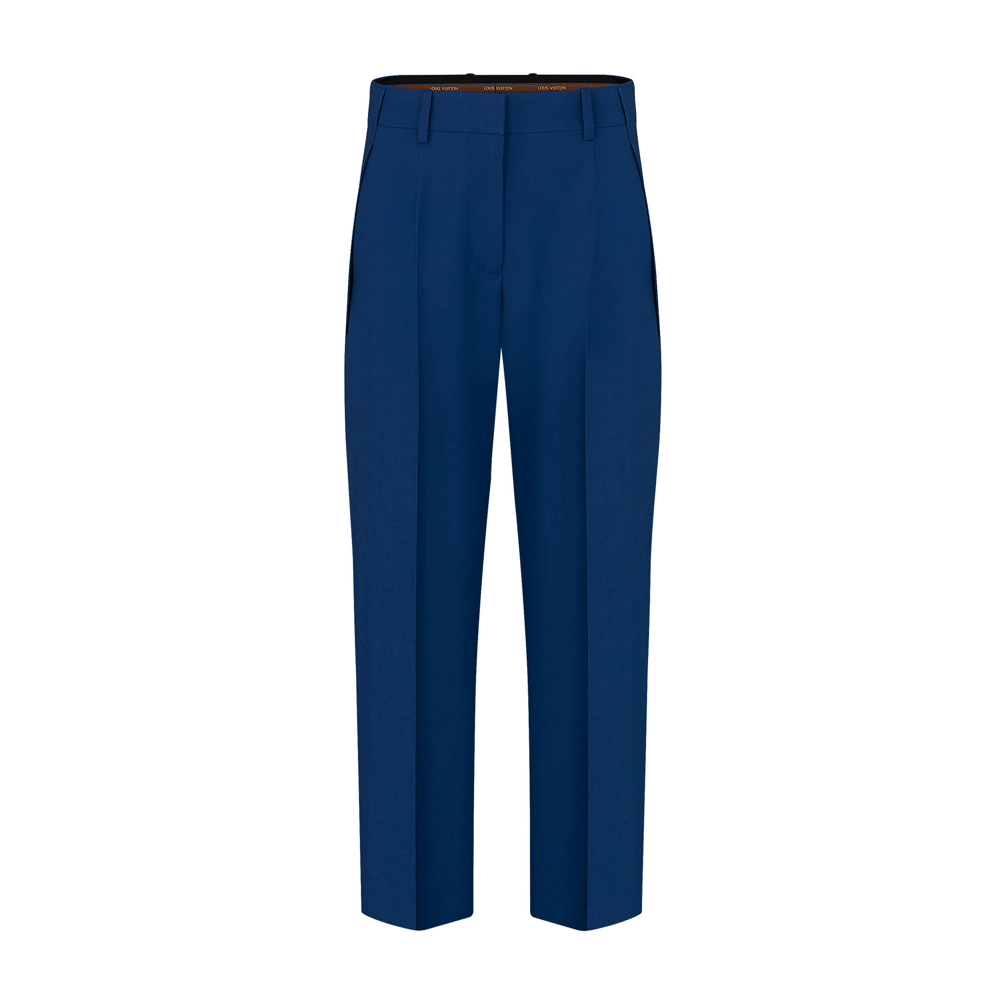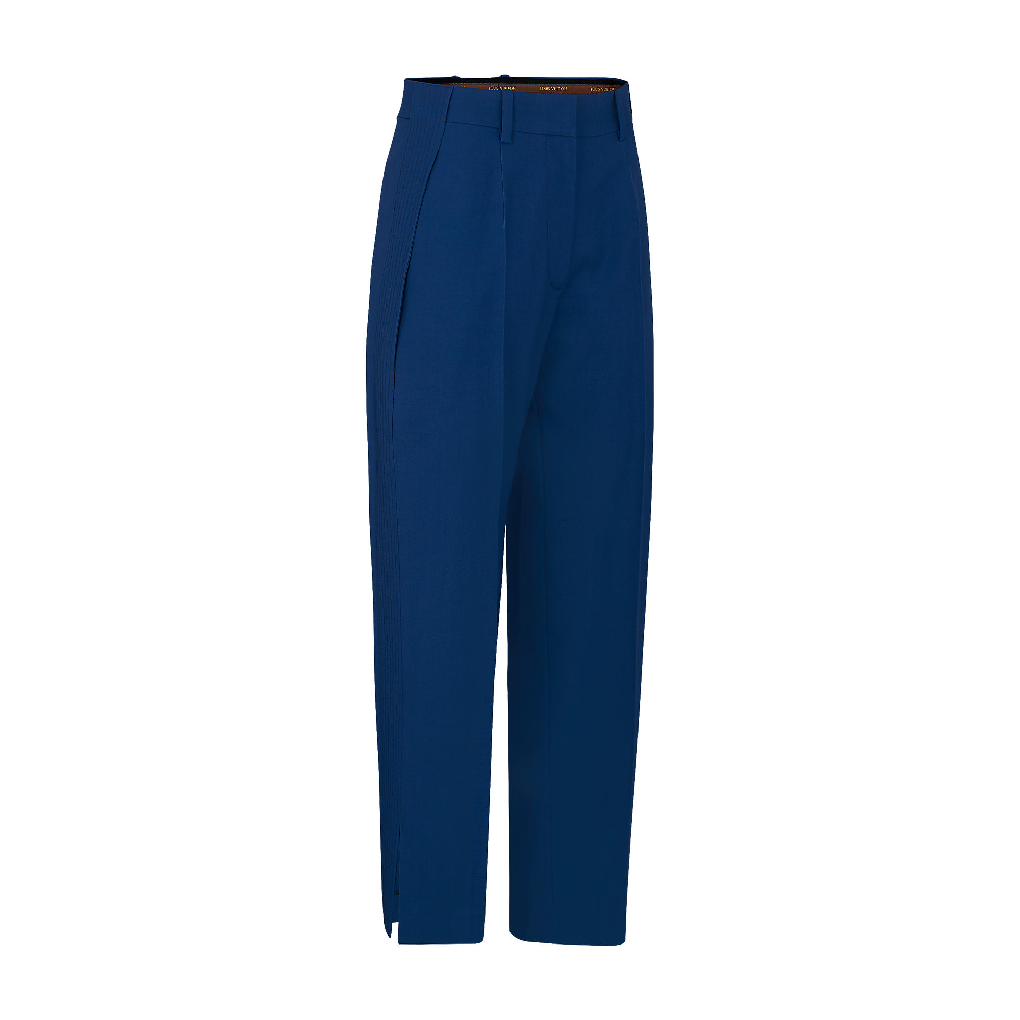 Tone-on-tone overstitched bands on either side give sophisticated flare to these wool gabardine pants. Details include three pockets and one small slit at the right hem.