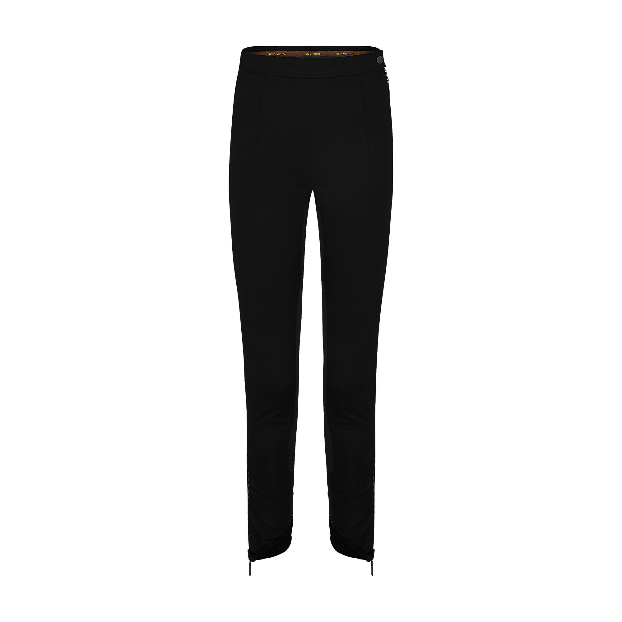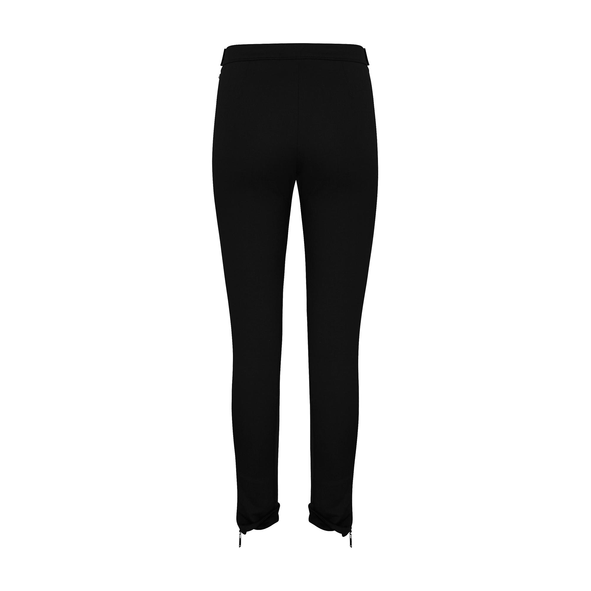 These stretch wool leggings have contrasting satin stretch bands running up the inside of either leg and zippers at the ankles. They close with a zipper on one side of the waist.