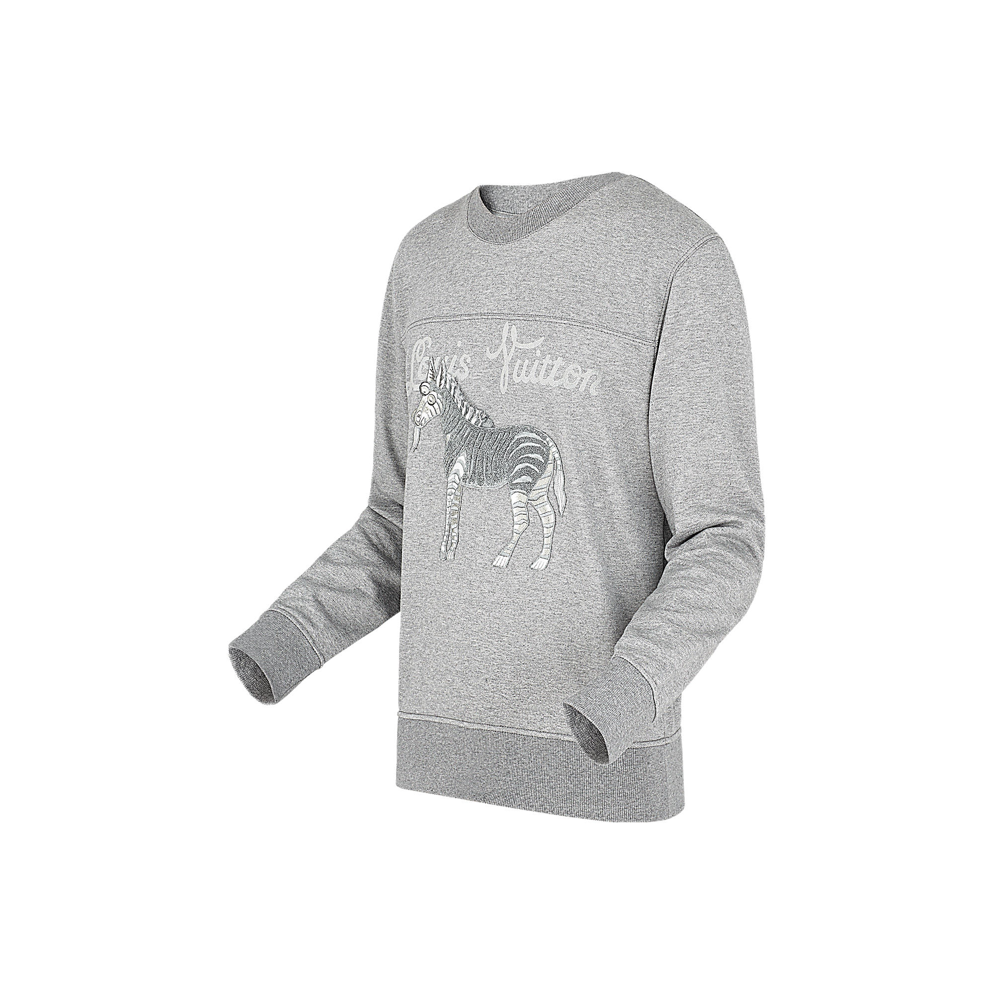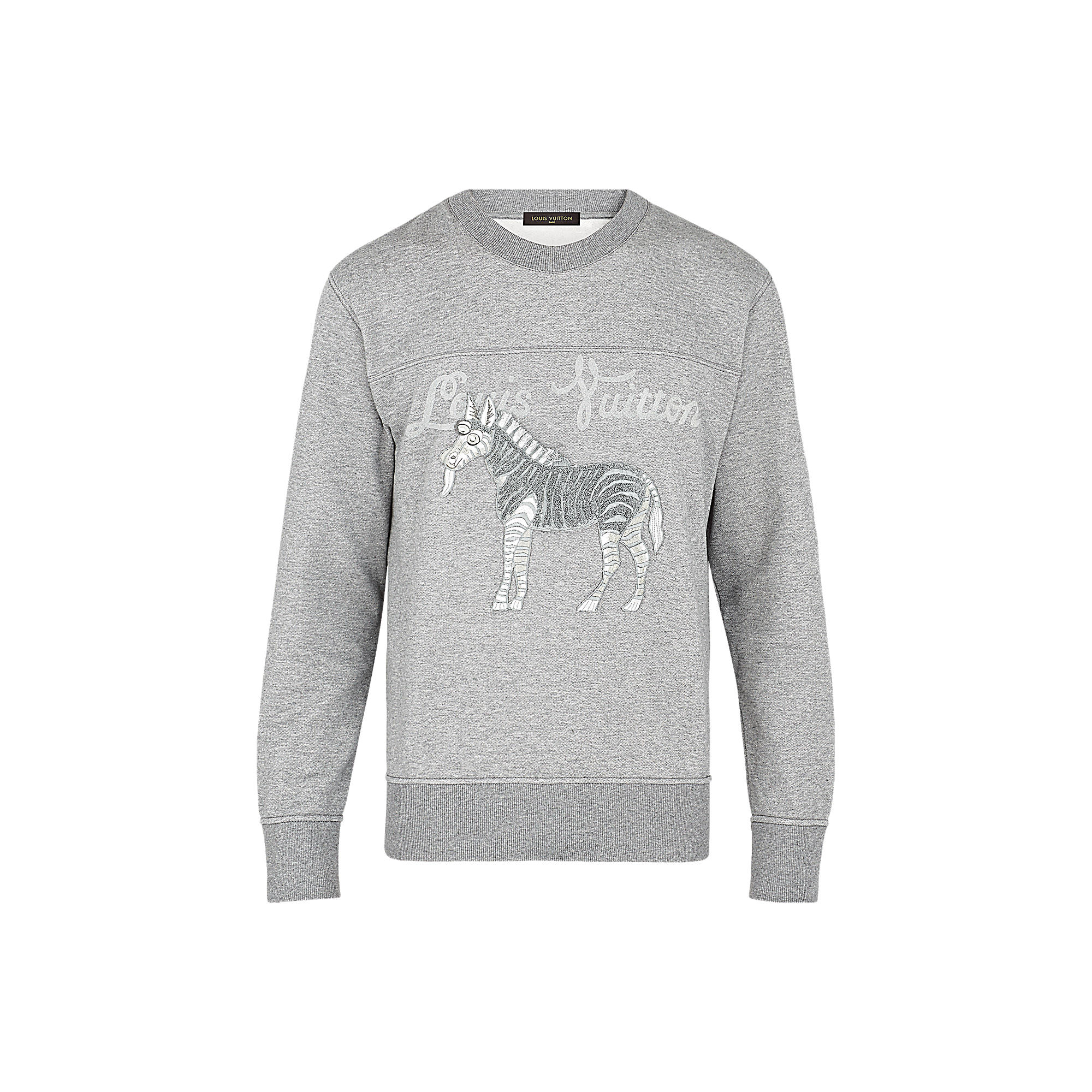 Cut from this season’s new compact jersey, this crewneck sweatshirt is embellished with a Louis Vuitton signature as a tone-on-tone flocked print along with one of the collection’s emblematic Chapman brothers animal patch.